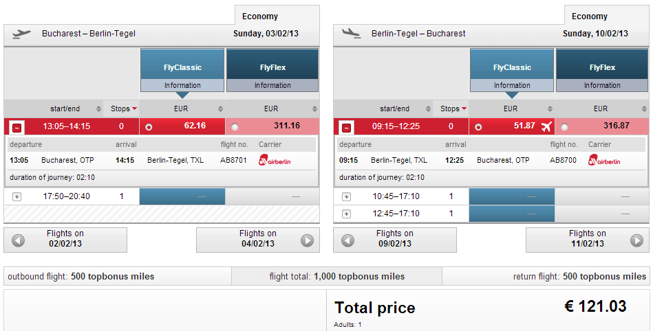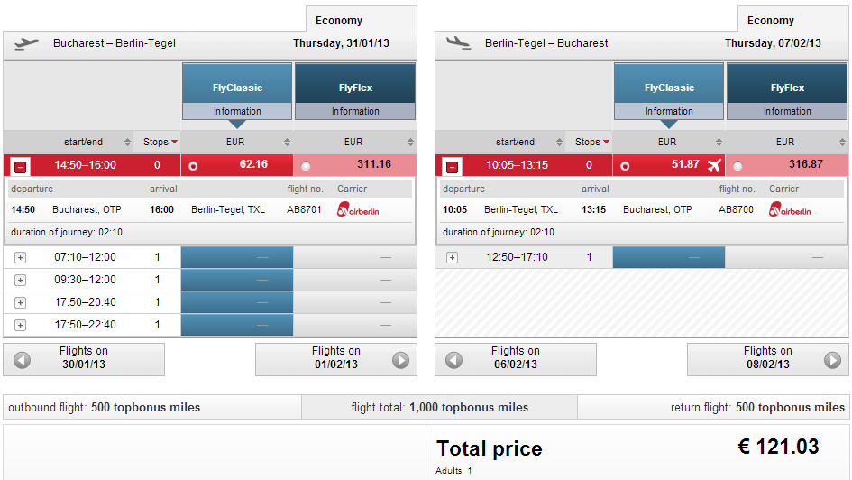 Mai jos aveţi calendarul preţurilor pe ianuarie – februarie şi dovezile cu orele pe zile. Am luat interval de 7 zile pentru a putea jongla mai uşor cu motorul de căutare de la AirBerlin.