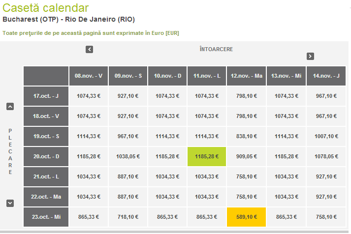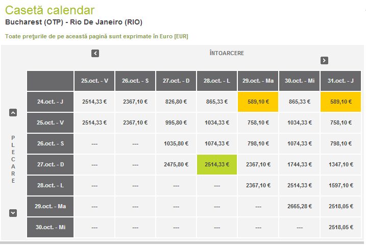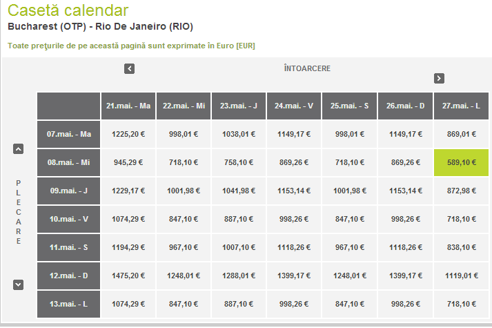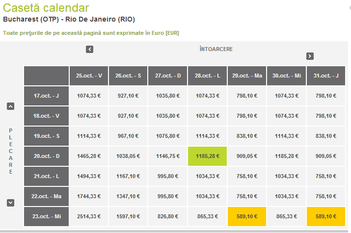 Ar fi bine sa vă grăbiţi pentru că oferta este limitată. Am găsit la 589.1 EUR, spre Rio de Janeiro, pentru perioadele: 8 mai – 27 mai, 23 octombrie – 29 octombrie, 23 octombrie – 31 octombrie, 23 octombrie – 5 noiembrie, 23 octombrie – 7 noiembrie, 23 octombrie – 12 noiembrie, 24 octombrie – 29 octombrie, 24 octombrie – 31 octombrie şi lista poate continua.