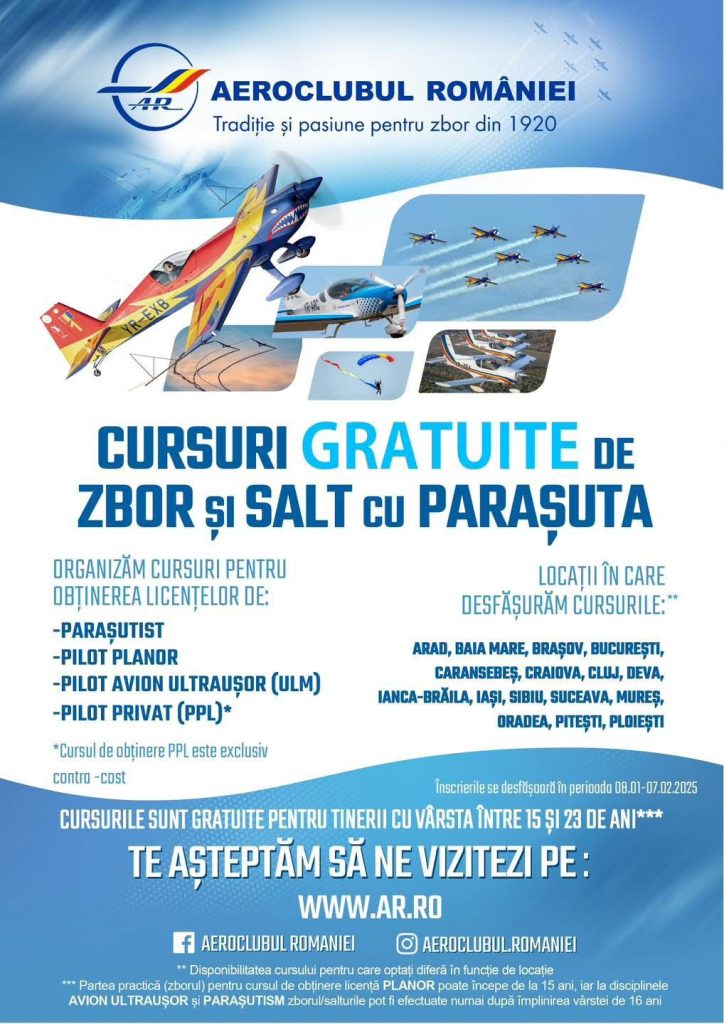 Dacă ai între 16 și 23 de ani, îndeplinește-ți visul de a zbura și obține-ți gratuit licența de pilot de avion ultraușor, planor sau licența de parașutist. Aeroclubul României a dat strat înscrierilor pe 08 ianuarie. Te vei putea înscrie până pe data de 7 feburarie. Nu rata ocazia si înscrie-te la unul dintre Aerocluburile Teritoriale: Arad, Baia Mare, Brașov, București, Caransebeș Cluj, Craiova, Deva, Iași, Oradea, Pitești, Ploiești, Satu Mare, Sibiu, Suceava, Târgu Mureș, Ianca. Pentru detalii suplimentare click AICI!