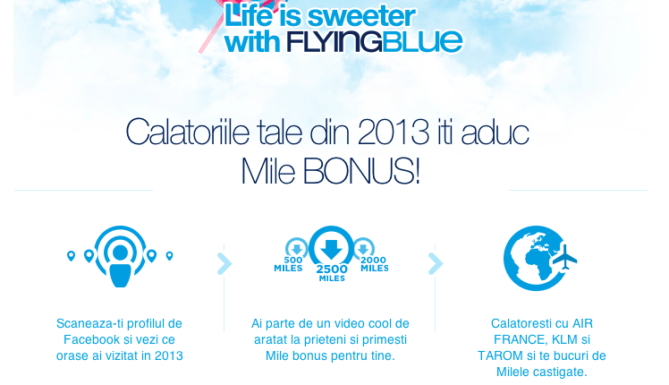– Non membrii Flying Blue care au instalat aplicația Facebook, au avut check-in-uri eligibile în 2013 (în afara tării lor de resedință) și au generat un video, vor putea primi 2000 Mile bonus. Cei care îl distribuie mai departe prietenilor de pe Facebook, vor primi un bonus de 500 Mile.