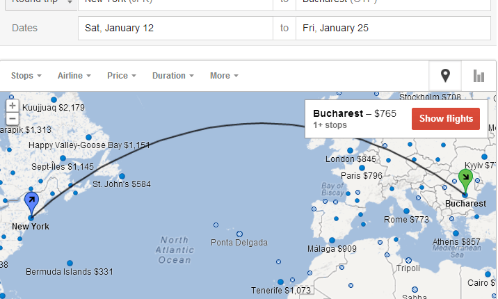 Am aruncat o privire, am făcut câteva simulări pe diferite destinaţii, am aplicat câteva filtre şi pare util. Am căutat cel mai ieftin bilet de avion spre Bucureşti, cu pleare din New York, iar rezultatul îl puteţi vedea mai jos.