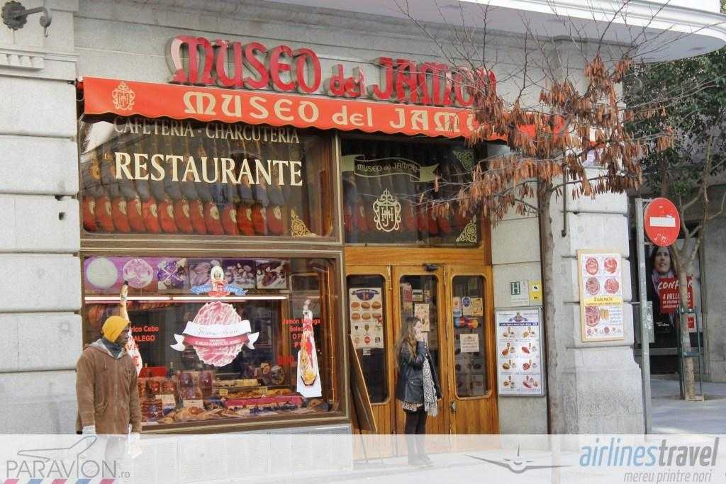 Însă, oriunde te uiţi, dai de jamon. Acesta este un preparat asemănător cu prosciutto la italieni. Jamonul din porc alb este serrano, iar cel din porc negru este iberico, printre cele mai scumpe preparate ale lor. Un lanţ de restaurante a ales să se numească „Museo del Jamon” şi este imposibil să nu dai peste unul indiferent de zona în care te afli în Madrid. În zona SOL sunt peste 10 astfel de restaurante. De curiozitate, am intrat într-unul dintre acestea şi am mâncat un sandwich cu jamon, asezonat cu un vin roşu. M-a costat aproximativ 10 EUR, dar a fost delicios şi pot spune că m-am săturat. Plus că peste tot vezi picioare de porc atârnate la uscat, tot felul de preparate. Am văzut jamon servit pe un pepene galben şi nu era desert.