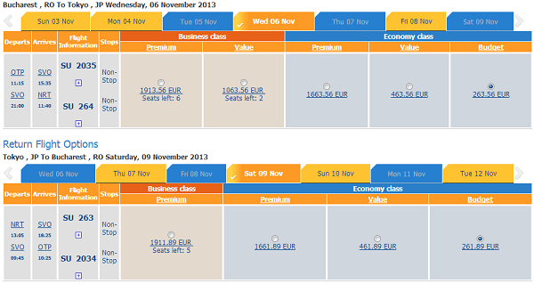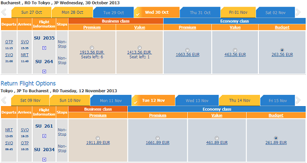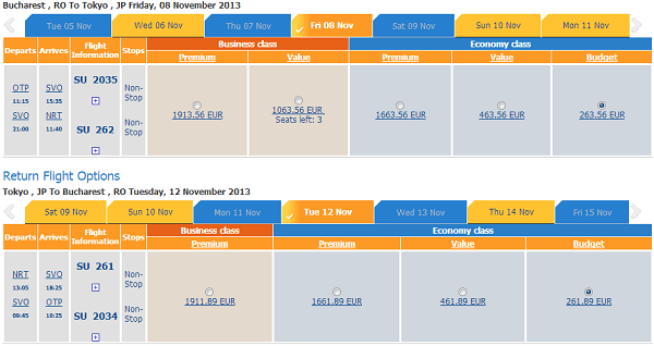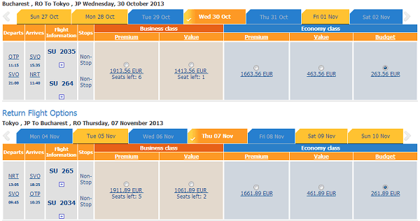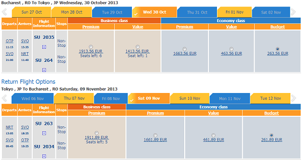 Bucureşti – Tokyo (Narita) – Bucureşti de la 525 EUR cu Aeroflot. Tariful este valabil pentru perioadele: 30 octombrie 2013 – 7 noiembrie 2013, 30 octombrie 2013 – 9 noiembrie 2013, 30 octombrie 2013 – 12 noiembrie 2013, 6 noiembrie 2013 – 9 noiembrie 2013, 6 noiembrie 2013 – 12 noiembrie 2013, 8 noiembrie 2013 – 12 noiembrie 2013 şi lista poate continua. Simulările au fost făcute pe site-ul Aeroflot. Sunt tarife şi de 575 EUR, 625 EUR, în funcţie de perioadele alese.