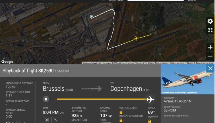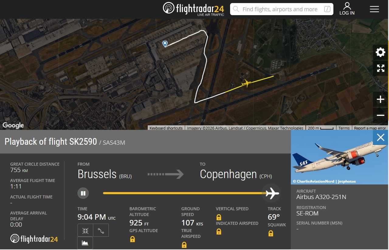 Zborul SAS SK-2590, programat pe ruta Bruxelles (BRU) – Copenhaga (CPH), a primit autorizare de decolare de pe pista 07L în jurul orei 21:03, ora locală.